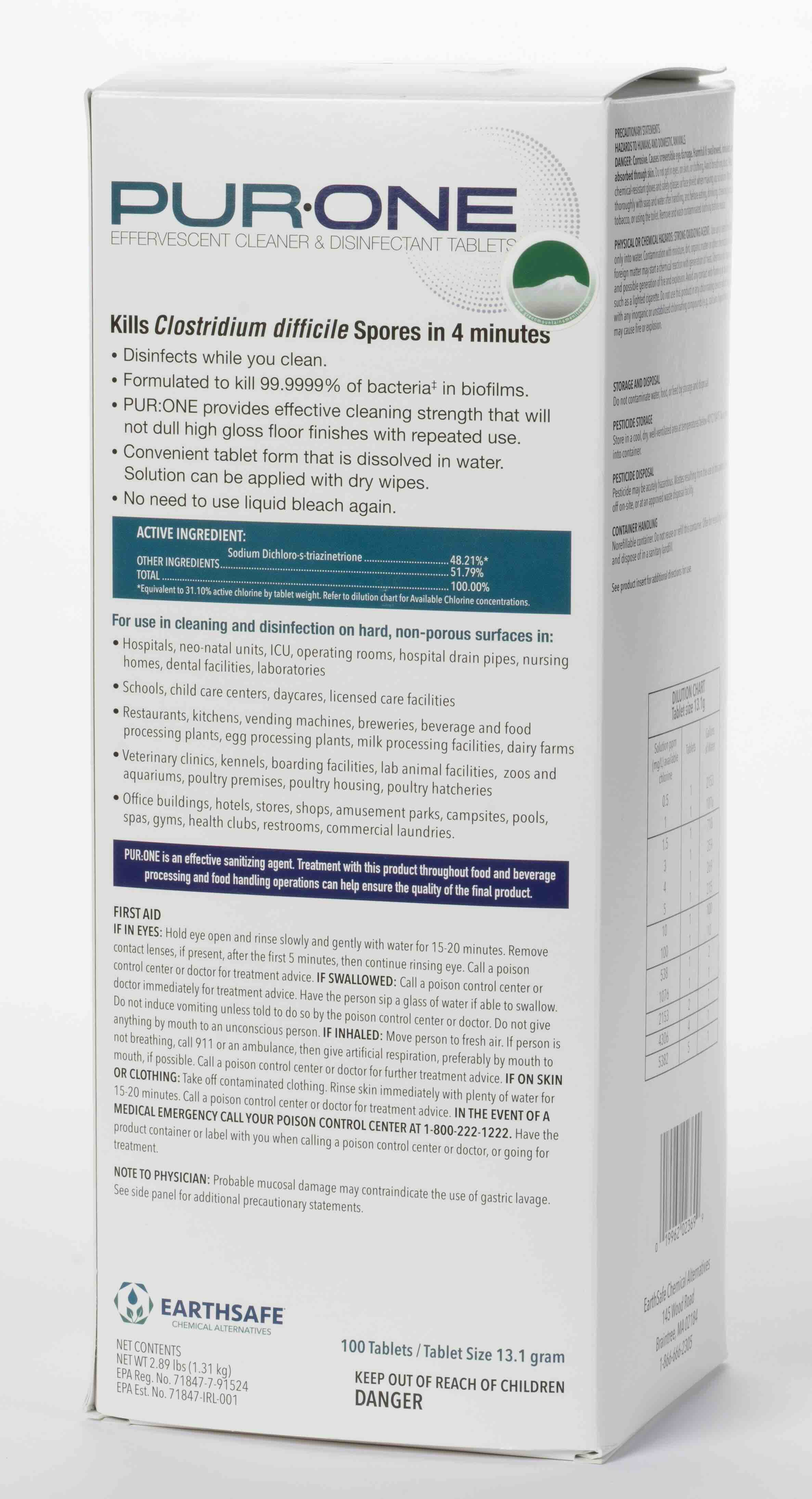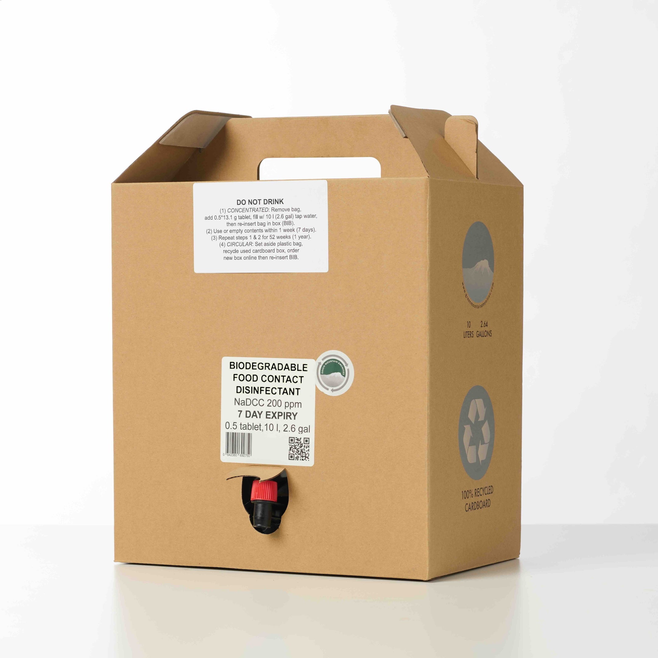 Sodium dichloroisocyanurate (NaDCC) with foaming surfactants cleans and disinfects food contact surfaces in one step!   50 tablets * 0.5 (200 ppm chlorine) = 100 * 10 l (2.6 gal) in reusable bag in boxes (r-BIBs)  = 1,000 l (26 gal) equivalent.