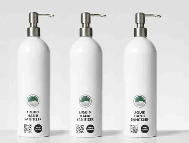 Aluminum bottles of 1000 ml (33.8 fl oz) capacity with stainless steel pumps sold in groups of three.